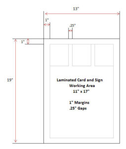 We can help you create your custom designs in only 24 hours with NO DIE CHARGE! We require a 0.75″ margins for 11″ × 17″ sheets and 1″ margins for 13″ × 19″ sheets around the material for our unique cutting process and 0.25″ gaps. This gives you a total working area of 9.5″ × 14.5″ on 11″ × 17″ sheets and 11″ × 17″ on 13″ × 19″ sheets (see images below).